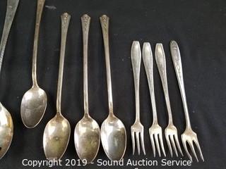Item Description: Reed & Barton card holder, International bowl, and various other silverplate utensils and spoons.