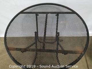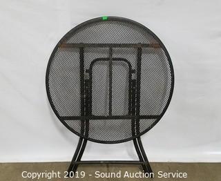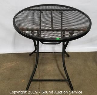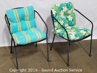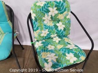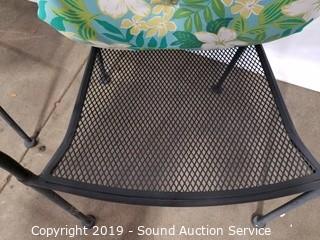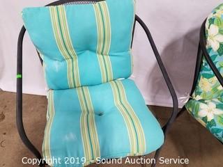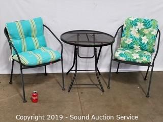 Item Description: 2 chairs with tie on chair pads and folding table. Table is 27" x 28". Chairs are 31" H, 23" W, 17" to seat.