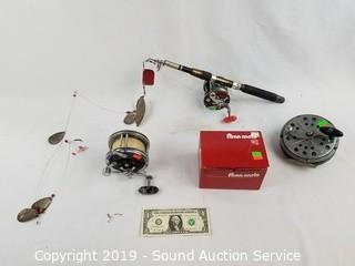 Item Description: Silver Eagle 7'ft telescopic rod, Penn Peer No. 209 Reel w/box, Penn no. 49 Super Mariner, Pflueger Pakron No. 3178.