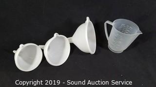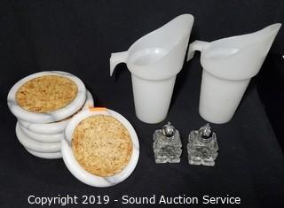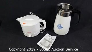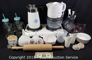 Item Description: Sunbeam hot pot, enamel coffee carafe, Pyrex glass measuring cups, marble coasters and more.