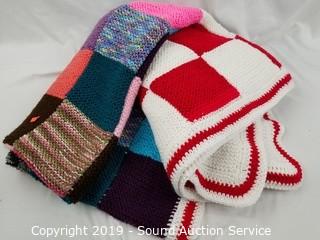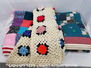 Item Description: 60" x 80" multi-color afghan, 56" x 46" flower afghan, and 8ft x 7ft quilt.