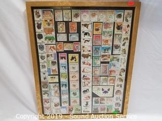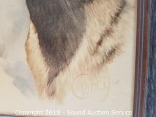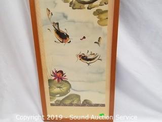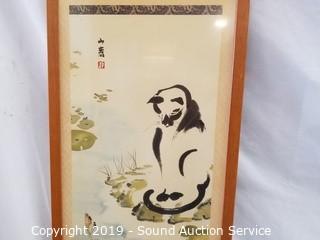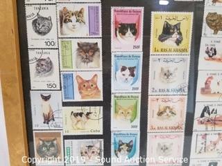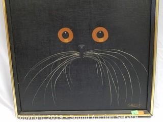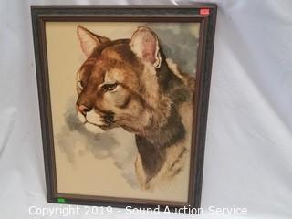 Item Description: An original Cougar painting signed, Clancy, 22" x 18". Original Asian cat & koi fish painting, 37" x 13". Framed cat stamps collage, 21" x 17". And original Gress cat oil painting, 17" x 21".