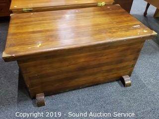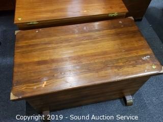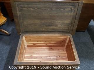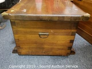 Item Description: Brass corner accents, dovetail construction, heavy duty. Some wear to the finish on the top, otherwise in good condition. Approx. 19" H, 40" W, 22.5" D.