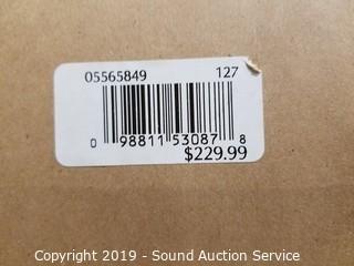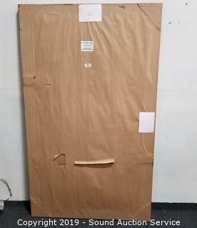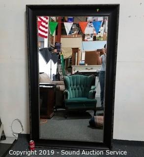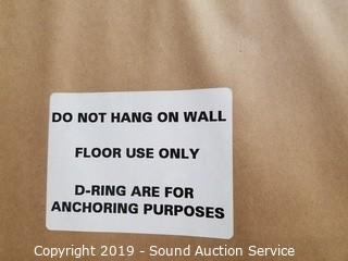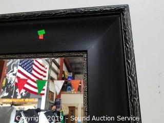 Item Description: Wood frame, partially beveled glass. Set to hang horizontally, it is heavy and has a sticker saying that it is not meant to hang, that the D-rings are for anchoring purposes only. Has a $230 price tag.