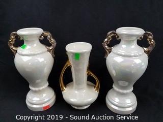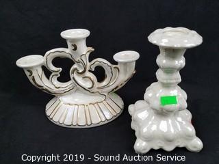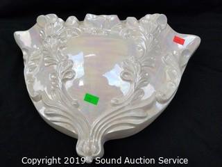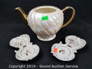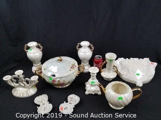 Item Description: 2 candle holders, wall pocket, teapot (no lid), 3 vases, 2 unique saucer dishes, and tureen.