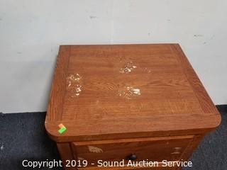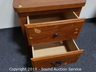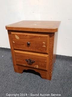 Item Description: Night stand has some wear to the finish, some water damage to the top, has 2 drawers, 21" x 21.5" x 18". Dresser appears to be in good condition, has an open back, upper cabinet with shelf and 2 lower drawers, 56" H, 33" W, 18" D.