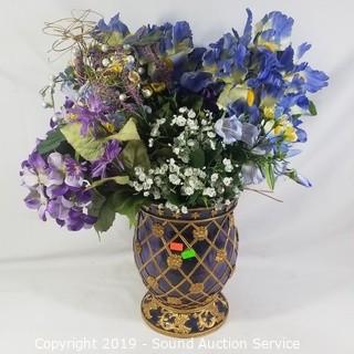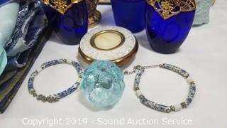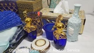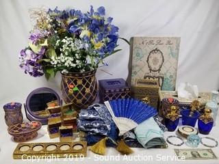 Item Description: Vase with floral arrangement and matching bathroom accessories, tissue cover, artwork, runners, candle votives, trinket boxes, and more.