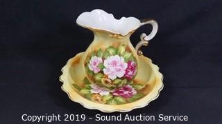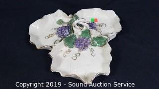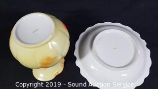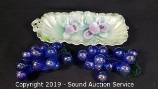 Item Description: Andrea by Sadek teapot, Made in Japan hand painted pitcher and basin, Avon Honor Society cups and saucers, glass grape bushels, plates, fairy light, candelabra, and more.