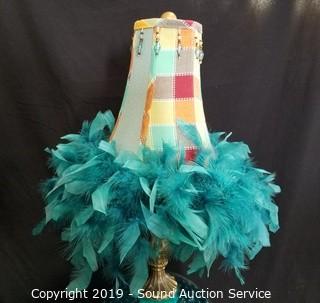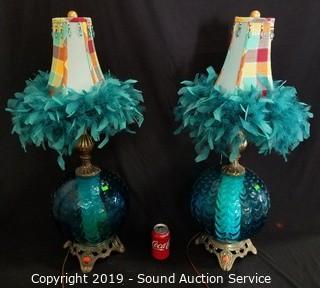Lot #0066: 2 Beautiful Blue Feather Fringe Shade Vtg. Lamps