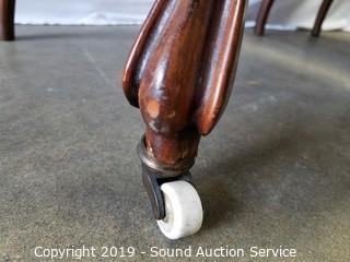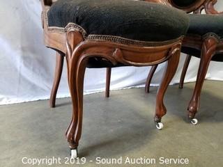 Item Description: Carved wood accents, ceramic casters on the front legs. One of the back supports has been repaired. Refer to photos for more information.