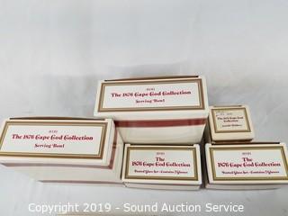 Item Description: Most all are in original boxes. Cape Cod dishes are Ruby red. Some full, some may be partial, please come in to preview for complete list of contents and levels of fullness.