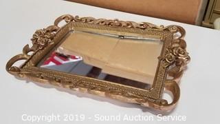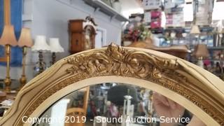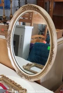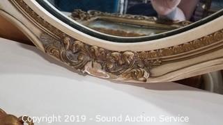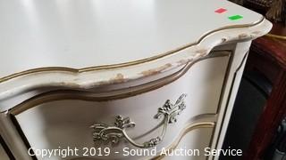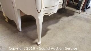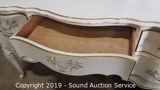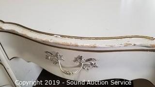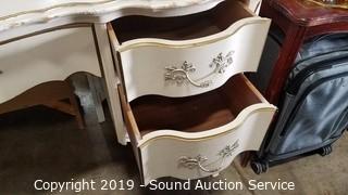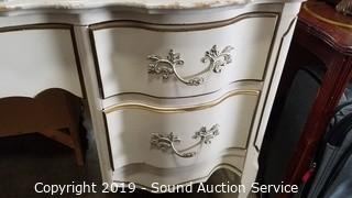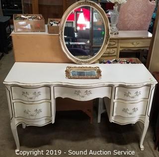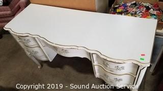 Item Description: Comes with mirror, doesn't look to be the original, hangs on the wall behind the vanity. Has some chipping along the front edge. Dovetail construction, oak drawers, serpentine front. Approx. 31" H, 50" W, 18" D with 19" x 23" mirror.