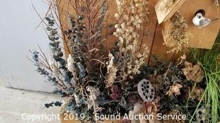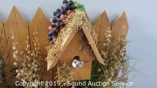 Item Description: Faux floral arrangement decorated with bird house. 30" H x 28" W x 7" D.