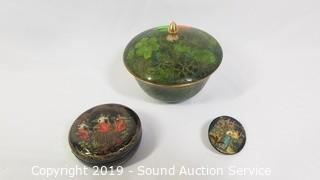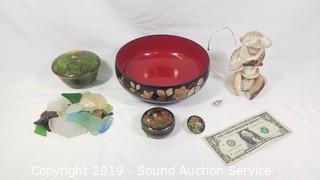 Item Description: Cloisonn? covered dish, 8" lacquered bowl, painted lacquered trinket dish and matching pin, Fisherman sea shell sculpture, 5" tall, glass chips. ATTN: NEW PICKUP WINDOW, 96 HOURS, NO EXCEPTIONS!
