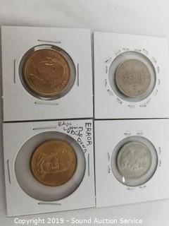 Item Description: 4 presidential dollars, Eisenhower dollar, silver Roosevelt dime, and various tokens. ATTN: NEW PICKUP WINDOW, 96 HOURS, NO EXCEPTIONS!