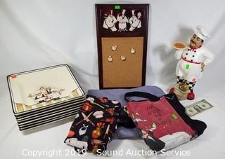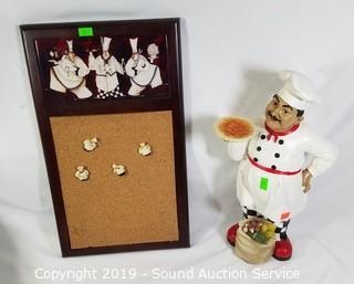 Item Description: 8 HD Designs plates (one has a chip), 3 aprons, cork board with pins, and 14" chef statue. ATTN: NEW PICKUP WINDOW, 96 HOURS, NO EXCEPTIONS!