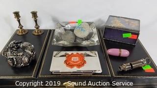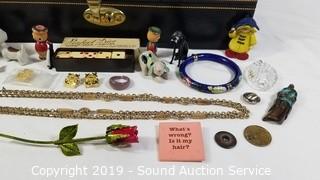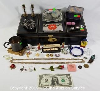Item Description: Chest is velvet lined, mirrored. Locking, no key. Comes with vintage musical compact with lipstick case, vintage dice, miniature figures, Cloisonn? bracelet, brooches, ash tray, candle holder and more. Chest is 3.5" x 15" x 8". ATTN: NEW PICKUP WINDOW, 96 HOURS, NO EXCEPTIONS!