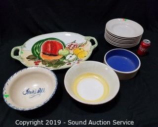 Item Description: 26" x 18" platter, "Grandpa's Popcorn" bowl, looks hand made, 4.5" x 11.5", World Ultima 12" soup bowls, hand painted Bizzirri hand made Italian bowl, 4" x 12.5", and other bowl. ATTN: NEW PICKUP WINDOW, 96 HOURS, NO EXCEPTIONS!