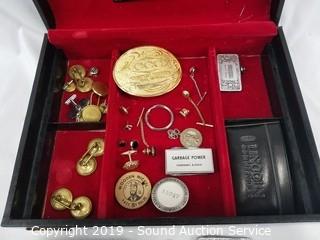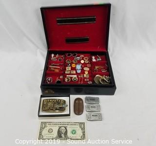 Item Description: Cuff links, belt buckles (one is solid brass), money clips, tie clips, pins, various tokens. Box is 2-tier, velvet lined, 3" x 11" x 8.5". ATTN: NEW PICKUP WINDOW, 96 HOURS, NO EXCEPTIONS!