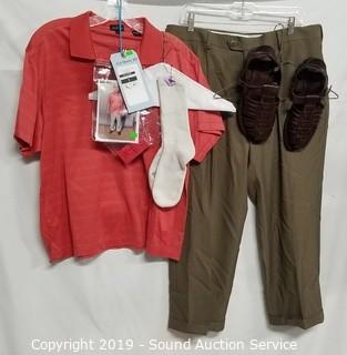 Item Description: Change 1, episode 203. Haeger brownish taupe pants, Jack Nicklaus red polo shirt, gold/black pinky ring, Jerusalem brown leather sandals, tech off white crew socks. Comes with scene and actor information and wardrobe photo. All items come from the set of Get Shorty at the conclusion of filming Season 3.