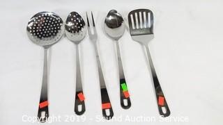 Item Description: All have lids. Includes: 2 boiling pots, 8" skillet, 11.5" frying pan, 5 stainless serving spoons, spatula, and carving fork. All in excellent like new condition.