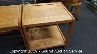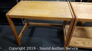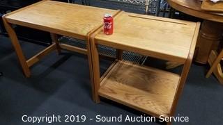 Item Description: One is 2-tier, has a couple pen marks. Could function as a desk. Approx. 26" x 25" x 21" and 26" x 33" x 21". In good condition, oak finish.