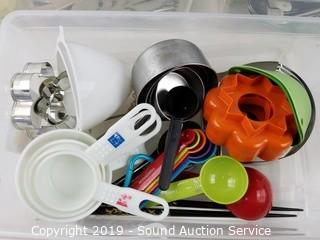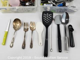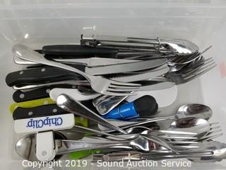 Item Description: Totes with lids included. Includes: Knives, forks, spoons, serving pieces, corn holders, measuring cups, and more. Totes are 4" x 8" x 13".