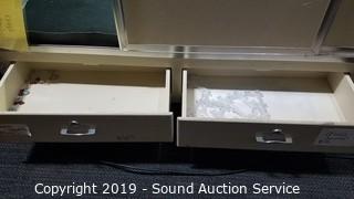 Item Description: The light on the right doesn't work, other does. Has sliding doors on the back and 2 drawers. Approx. 38" H, 67" W, 19.5" D.