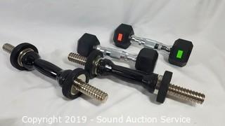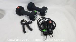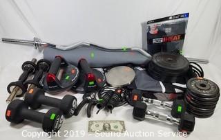 Item Description: Perfect Push Up handles, Adidas athletic drawstring bags, NIP 32 Degrees Heat large shirt, dumbbells, weights, weight bar, and jump rope.