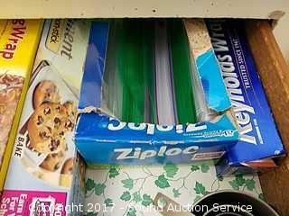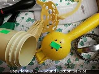 INcludes: measuring cups, tin foil, wax paper, ziploc bags, lemon juicer, wooden spoons, measuring spoons and more.
