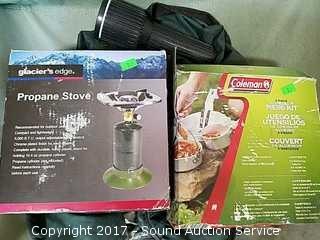 Includes: 4 outdoor folding chairs, Coleman aluminum mess kit, flashlight and propane camp stove.