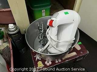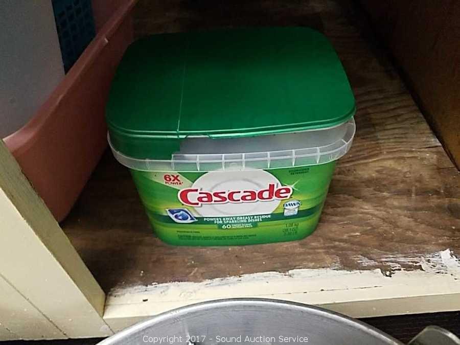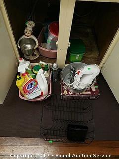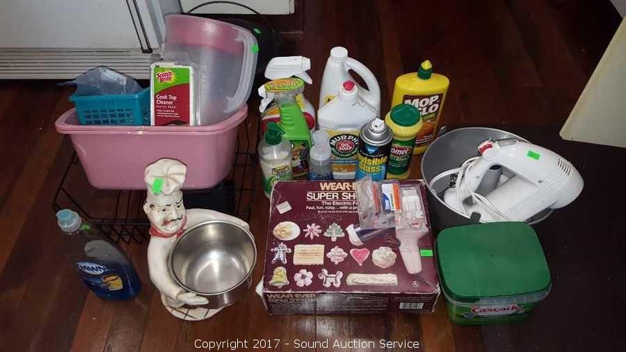 Includes: Drying rack, Wear-ever foodgun, hand mixer, 409, dawn dish soap, cascade dishwasher packs and more.