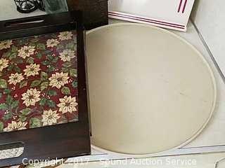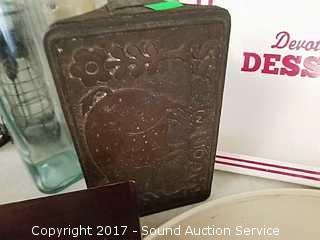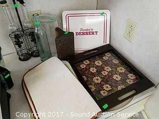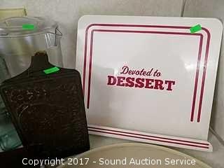 Includes: metal dessert sign, bacon press, dish drying mats, lazy susan, tray, bottles in wire holder and more.