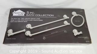Item Description: By Home Zone. Complete, looks to be brand new. Includes: 2 towel bars, toilet paper holder, double robe hook and towel ring.