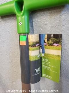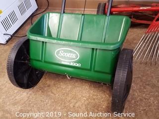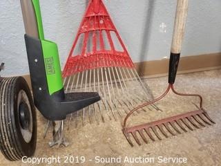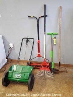 Item Description: Brush rake, leaf rake, weed puller, Scott's Accu-Green 1000 Seeder Spreader.