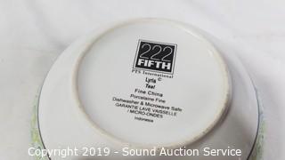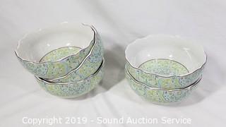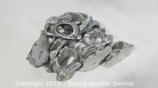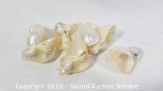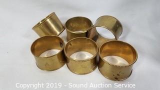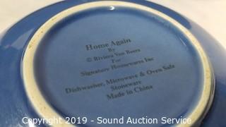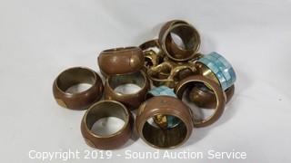 Item Description: Various brass, seashell, terracotta, and pewter napkin rings, 5 Stone Crest mugs, 5 22 Fifth bowls, 3 Home Again blue leaf print nesting bowls, and AVC roaster.
