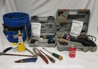 Lot #0287: Ryobi Angle Grinder, Cordless Drill & Bucketeer