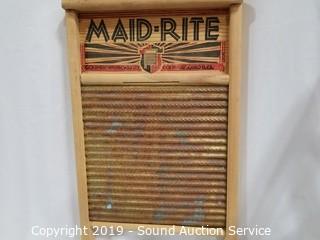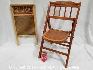 Item Description: Maid-Rite washboard 24" x 12". Babee-Tenda folding chair, 25" H x 14" W, 13" to seat.