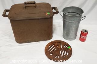 Lot #0303: Vtg. Copper Boiler Pot, Cast Iron Trivet & Bucket