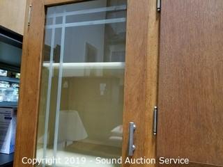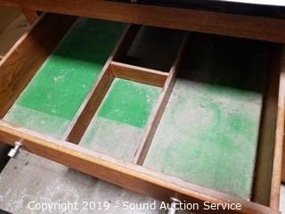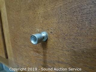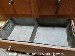 Item Description: Dovetail construction, solid oak. Pull out steel enamel tray, lower drawers are steel lined, tambour front door. Some of t6he drawers are felt lined. 78" T x 63" W x 24" D. Left top drawer has a break, missing a piece.