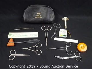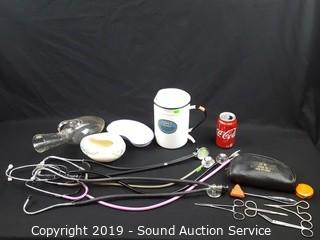Item Description: 5 Stethoscopes, glass and ceramic urinal bed pans, enamelware Jones irrigator, bag with various scissors & medical supplies.