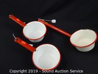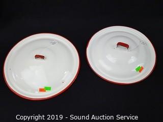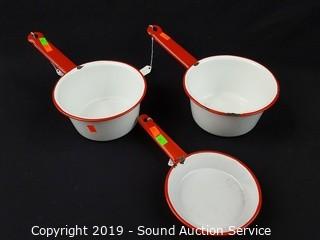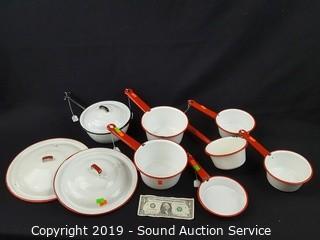 Lot #0065: 10pc Red/White/Black Enamelware Pans