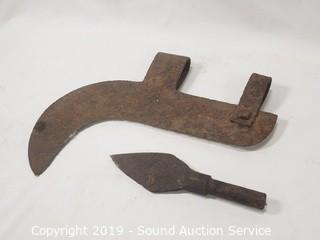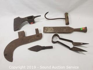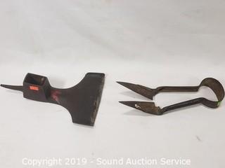 Item Description: Bill hook axe head, Large 6" chisel head adze, spear head, hay hook, shears.