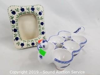 Item Description: Includes 4 goblets, egg coddler (refer to photos for makers mark), (3) 6" bowls, 4 coffee mugs, 2 tea cups, 2 saucers, covered dish and mug (some chips), picture frame and sectional dish. 1980s and pre 1980s makers marks.