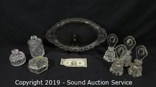 Item Description: Includes 4 perfume bottles, powder dish, 14" oval tray and 2 crystal covered dishes. Perfumes are approx. 7" tall.
