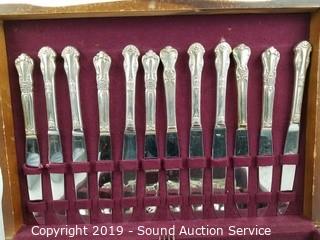 Item Description: Appears to be a mixed set. 15 butter knives, 31 teaspoons, 16 dinner forks, 17 salad forks, 5 serving pieces and serving spoon and fork set with cobalt insert. A majority of the set is King Edwards silverplate. Also contains W.M.Rogers and Old Company Plate. Comes with flatware chest.