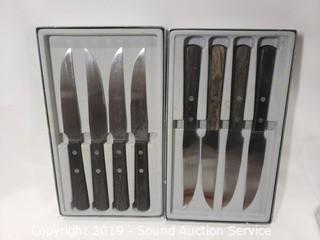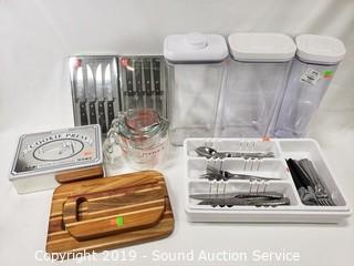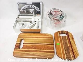 Item Description: 4 Pyrex measuring cups 1cup to 4 cup, 3 press and seal storage containers, 8pc Zwilling J.A.Henckels steak knife set, William Sonoma cookie press, hammered handle stainless flatware set w/tray and 2 wood cutting boards.