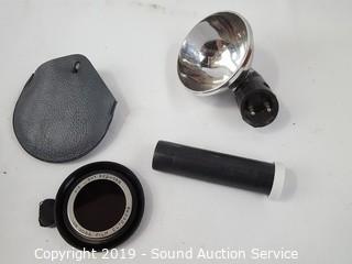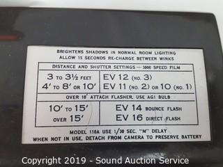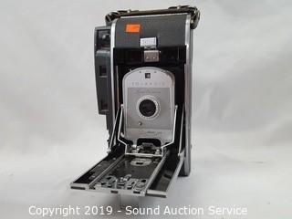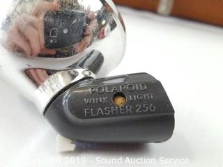 Item Description: Camera is c. 1957, comes with original case, 5 Polaroid Land roll film color/75 speed 3.25/4.25" with original box, Polaroid mink-light flash model 250, mink-light flasher model 256. Camera bag is thick leather 9" x 13.5" x 4.5".