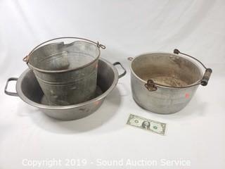 Lot #0245: Vtg. Galv. Pail, Stainless & Aluminum Pots