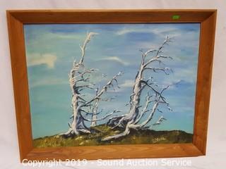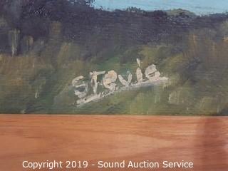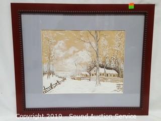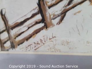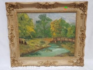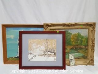 Item Description: F. T. Daruill snowy cottage painting 22" x 18.5", Holly Wilcox antique framed bridge and creek scene painting 26" x 22", and Stevie tree scene painting 21" x 26.5".